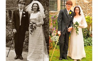 L-R: Stephen Hawking, Jane Wilde, Eddie Redmayne [Hawking], Felicity Jones [Jane]